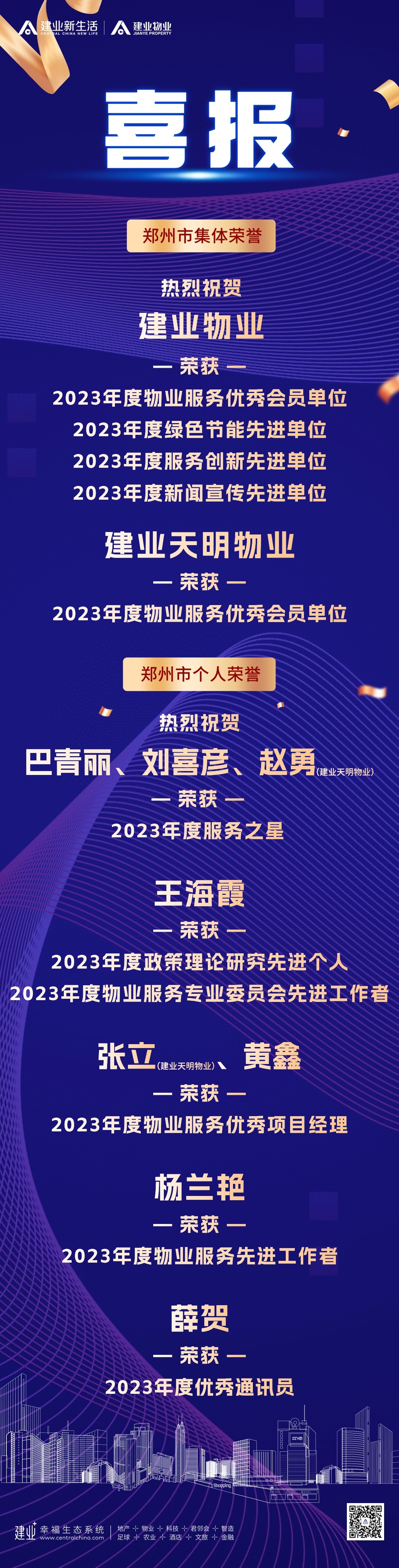 近日,建業(yè)物業(yè)及子公司林州六合物業(yè)、建業(yè)天明物業(yè)連續(xù)榮獲多項集體榮譽及個人榮譽,充分體現(xiàn)了市場、行業(yè)與業(yè)主對建業(yè)物業(yè)的認可與肯定。